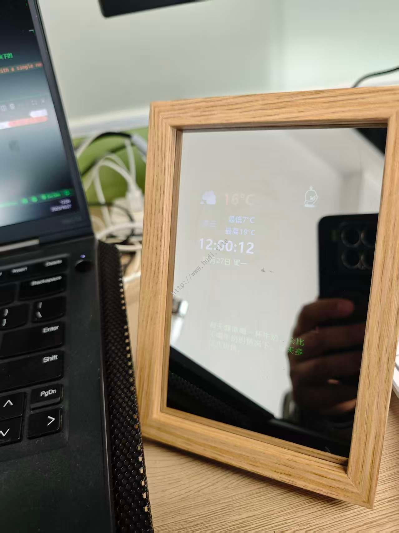 镜子左上角是淘晶驰屏幕,主要显示时间、日期和天气,天气的信息来源心知天气。右上角是12864屏幕,主要显示小动画。下方是Usart-GPU屏幕,从我自己的网址随机获取一些文字显示。小镜子是在拼多多买的中空流麻套件,提供一个单面镜和木盒子,正好可以放进所有的元器件并显示,屏幕用电工胶布直接粘在单面镜上,显示效果也还行: