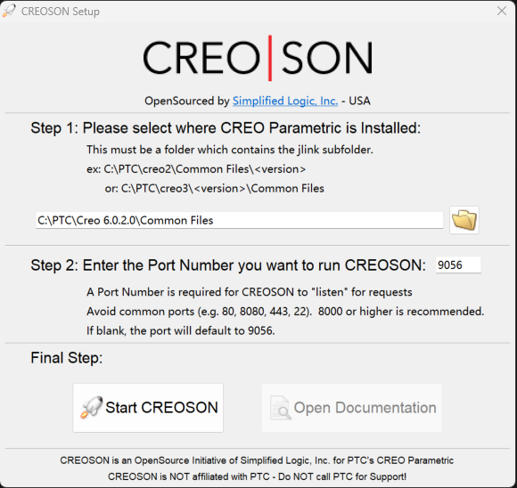 首先确保JLINK已正确安装。在官网下载 CREOSON Server,地址在https://github.com/SimplifiedLogic/creoson/releases。下载解压后,运行目录下CreosonSetup.exe,在 Step 1:栏输入正确的CREO安装目录,点击 Start CREOSON,就可以启动CREOSON服务,如下图所示:
